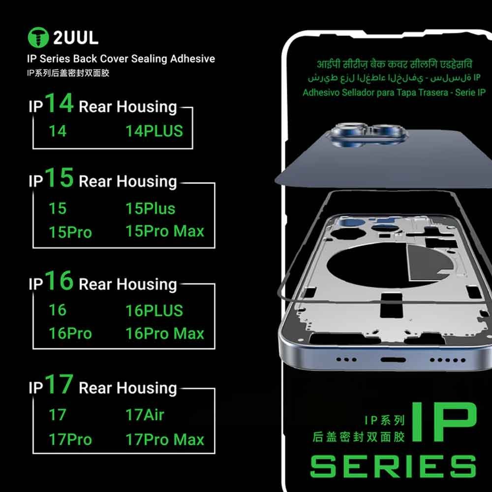 The 2UUL Back Cover Sealing Adhesive for iPhone 14-17 Series is a professional-grade adhesive solution engineered specifically for re-sealing the back glass on Apple iPhone models from the iPhone 14 through iPhone 17 series. Whether you’re a mobile repair technician or DIY enthusiast, this 5-piece pack of precision-cut adhesive strips ensures a strong, reliable bond between the back glass and frame — restoring structural integrity, dust resistance and water-resistant sealing after screen or back cover repair.