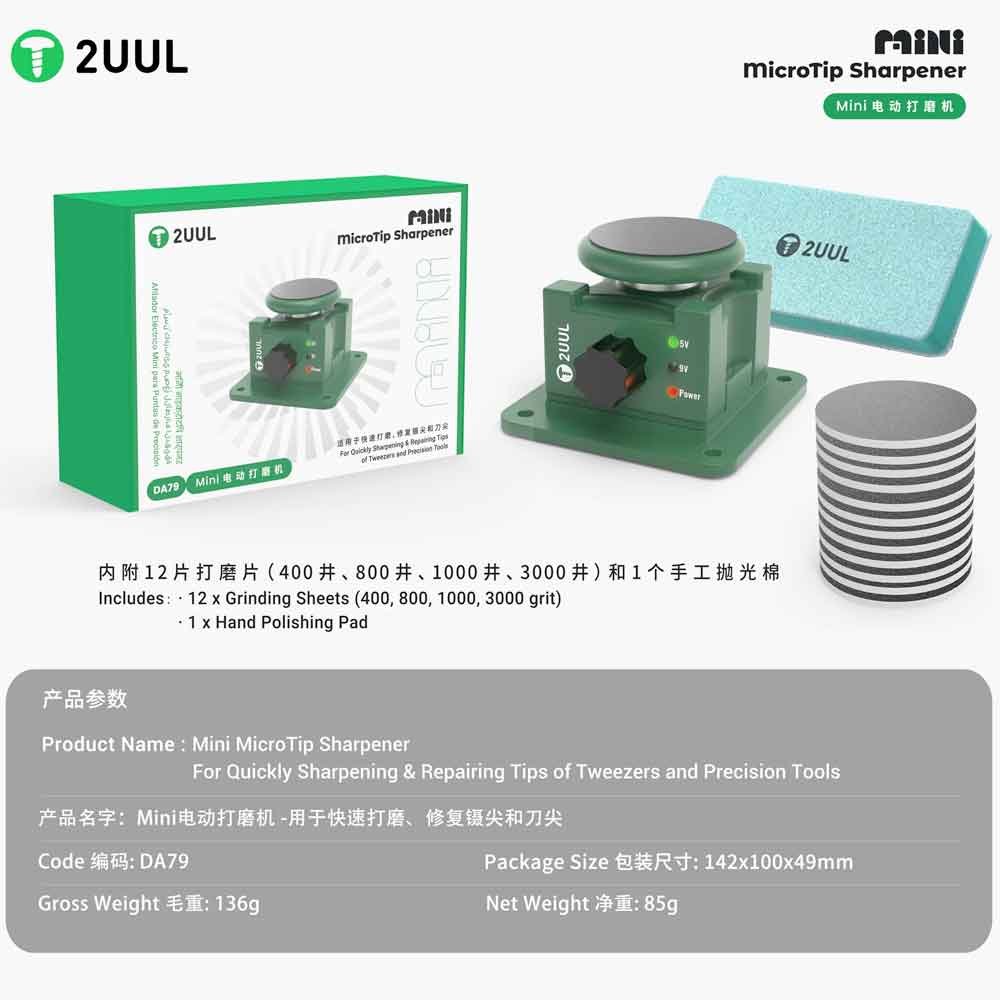 The 2UUL DA79 Mini MicroTip Sharpener is a precision sharpening station designed to give your fine-tip soldering irons and micro tools a razor-sharp edge every time. Whether you’re a professional repair technician or an electronics hobbyist, this mini sharpener delivers consistent, accurate tip refinement for enhanced soldering performance and longer tip life.