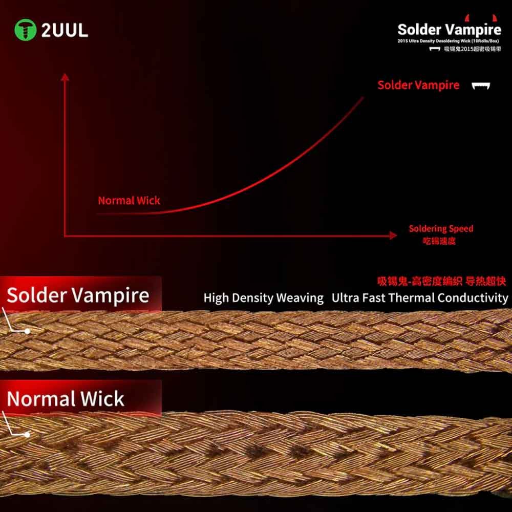 The 2UUL DW15 Solder Vampire Desoldering Wick 2015 (10 Rolls/Box) is a professional-grade solution for efficient solder removal during PCB and mobile phone repairs. Crafted from high-purity copper braid, it delivers fast heat transfer and superior solder absorption, even on fine-pitch components.
