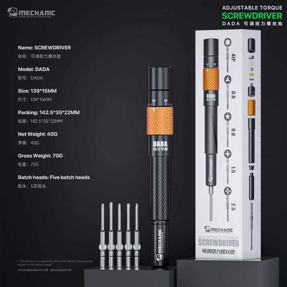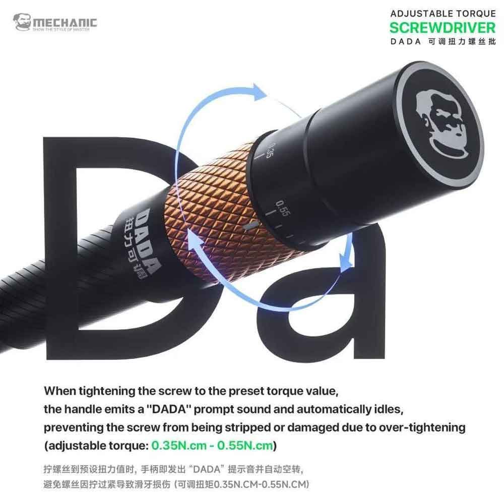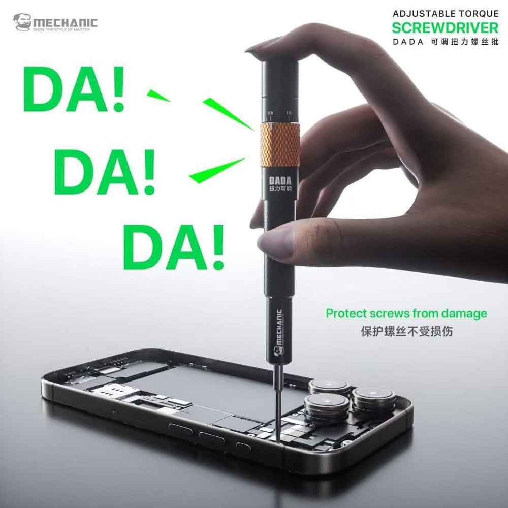 The Mechanic DADA Adjustable Torque Screwdriver is a professional-grade precision tool designed for safe and accurate fastening in delicate electronics repair. With its adjustable torque control system, it helps prevent over-tightening and screw slippage, protecting sensitive components during mobile phone, laptop, and PCB repairs.