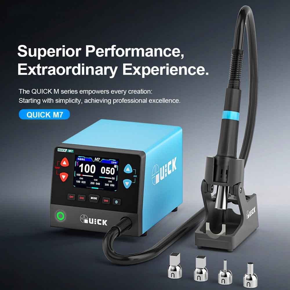 The QUICK M7 1000W 9-Channel HD Digital Display Intelligent Hot Air Gun Desoldering Station is a professional-grade solution engineered for advanced PCB, motherboard and chip-level repair. Built for precision and stability, it delivers powerful and consistent hot air output for efficient desoldering and rework applications.