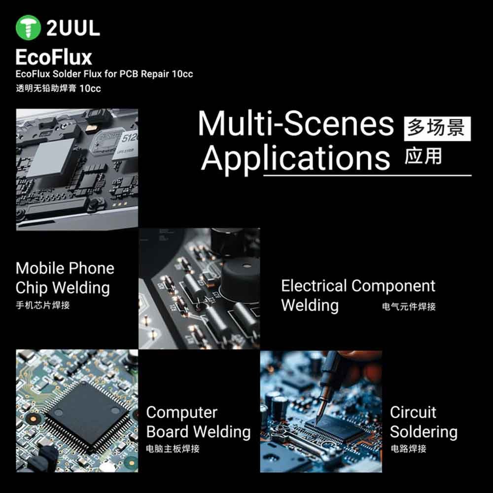Enhance your soldering results with the 2UUL SC11 EcoFlux solder flux — a professional-grade, lead-free liquid flux formulated for modern electronics repair and assembly. This eco-friendly formulation ensures excellent activation and superior wetting properties, enabling smooth, efficient solder flow that promotes stronger joints and fewer defects.