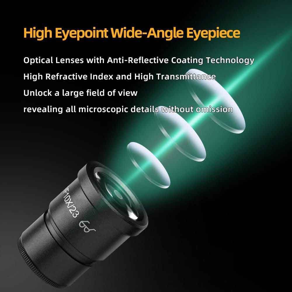 - Wide-Angle High-Eyepoint Eyepieces (WF 10X/23 mm) — Provides broad field of view and comfortable observation even during long repair sessions.